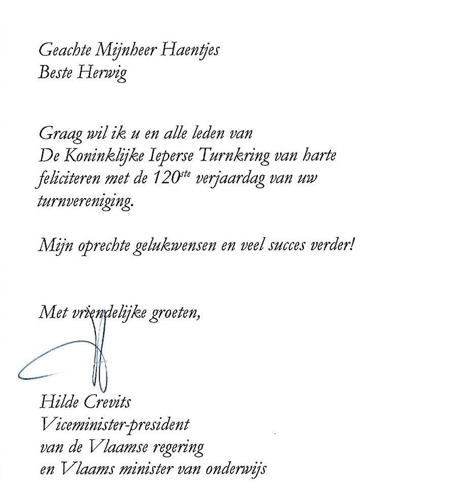 Viceminister-president van de vlaamse regering en Vlaams minister van onderwijs Hilde Crevits feliciteert de Koninklijke Iepers Turnkring vzw met haar 120ste verjaardag!